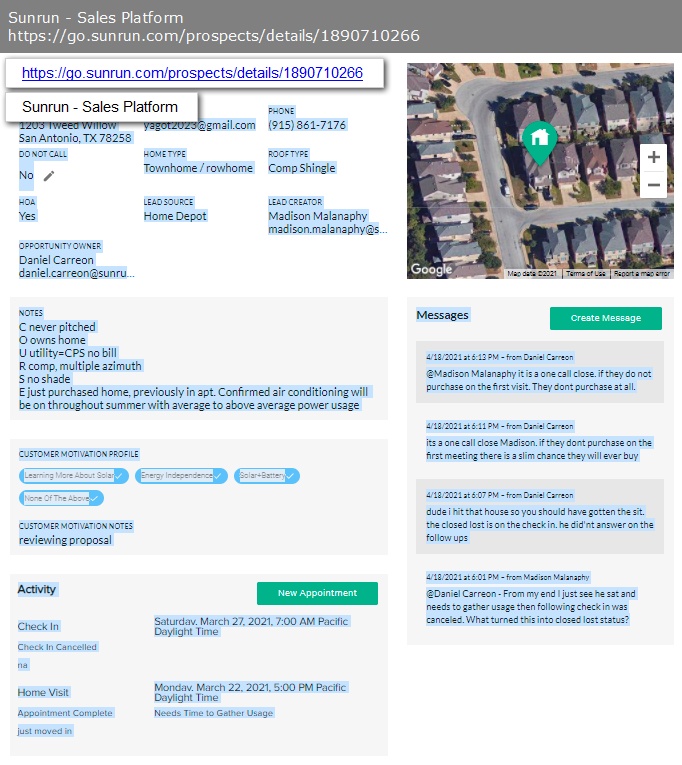 Back to Sales DashboardrnprofilernMadisonrnNotificationsrnthrough 4/25/2021rnYou have no messages to view.rnSee MorernOscar TapiaStage - 11. Closed LostrnADDRESSrn1203 Tweed WillowrnSan Antonio, TX 78258rnEMAILrnyagot2023@gmail.comrnPHONErn(915) 861-7176rnDO NOT CALLrnNornHOME TYPErnTownhome / rowhomernROOF TYPErnComp ShinglernHOArnYesrnLEAD SOURCErnHome DepotrnLEAD CREATORrnMadison Malanaphyrnmadison.malanaphy@sunrun.comrnOPPORTUNITY OWNERrnDaniel Carreonrndaniel.carreon@sunrun.comrnNOTESrnC never pitchedrnO owns homernU utility=CPS no billrnR comp, multiple azimuthrnS no shadernE just purchased home, previously in apt. Confirmed air conditioning will be on throughout summer with average to above average power usagernCUSTOMER MOTIVATION PROFILErnLearning More About SolarrnEnergy IndependencernSolar+BatteryrnNone Of The AbovernCUSTOMER MOTIVATION NOTESrnreviewing proposalrnActivityrnCheck InrnSaturday, March 27, 2021, 7:00 AM Pacific Daylight TimernCheck In CancelledrnnarnHome VisitrnMonday, March 22, 2021, 5:00 PM Pacific Daylight TimernAppointment CompleternNeeds Time to Gather Usagernjust moved inrnrnMessagesrn4/18/2021 at 6:13 PM – from Daniel Carreonrn@Madison Malanaphy it is a one call close. if they do not purchase on the first visit. They dont purchase at all.rnrn4/18/2021 at 6:11 PM – from Daniel Carreonrnits a one call close Madison. if they dont purchase on the first meeting there is a slim chance they will ever buyrnrn4/18/2021 at 6:07 PM – from Daniel Carreonrndude i hit that house so you should have gotten the sit. the closed lost is on the check in. he did'nt answer on the follow upsrnrn4/18/2021 at 6:01 PM – from Madison Malanaphyrn@Daniel Carreon - From my end I just see he sat and needs to gather usage then following check in was canceled. What turned this into closed lost status?rnrnhttps://go.sunrun.com/prospects/details/1890710266