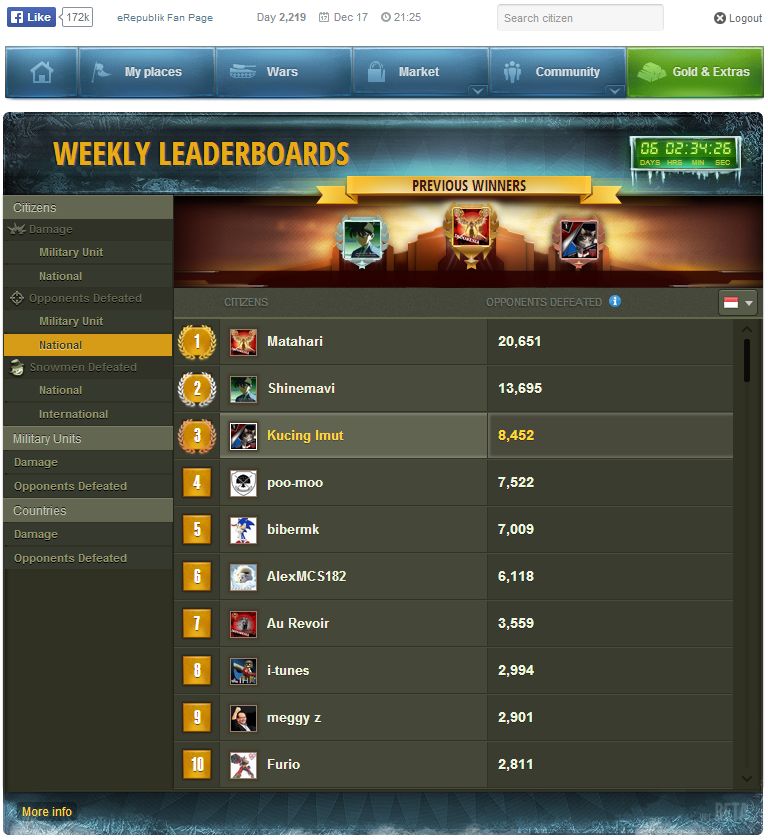 Military Unit (Opponent Defeated) National - 8452 ++, Day 2,211 - 2,218 2013