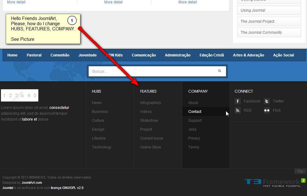 Hello Friends JoomlArt,rnPlease, how do I changernHUBS, FEATURES, COMPANY.rnSee PicturernBy inserting them was not correctly, see:rnPlease advise where is my mistake.